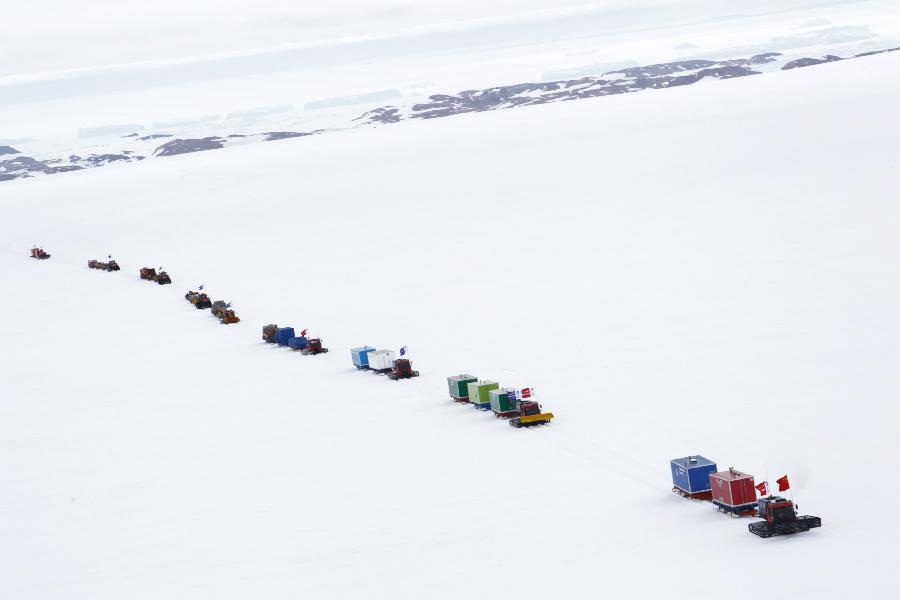 A squad team of Chinese Antarctic exploration team drives in Antarctic on Dec. 16, 2012, before leaving for China's Kunlun station. The journey is the country's 29th scientific expedition to Antarctica. A significant part of the mission will also include looking for a location for the country's fourth station in the region and second-phase construction of the Kunlun Station. (Xinhua/Xu Wei)