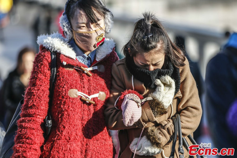 People walk against strong wind in Beijing, December 17, 2012. As gales hit the capital, the lowest temperature is expected to plummet to 10-15 degrees below zero centigrade after the winter solstice (around December 21). [Photo: CNS/Zhang Hao]