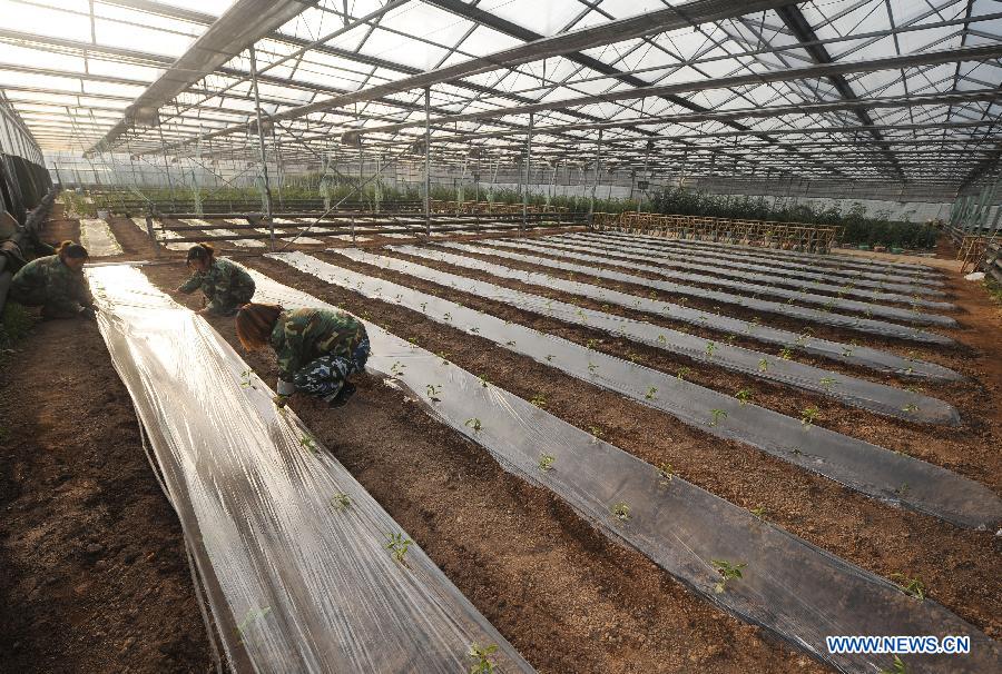 Villagers plant vegetables in a greenhouse in Jingadao Village of Changzhi County, north China's Shanxi Province, Dec. 11, 2012. Jingadao Village of Changzhi County has formed a recycling economy. Villagers here use marsh gas as fuel after fermenting pig excrement, adopt clean sewage disposal system, produce natural fertilizer with animal excrement and plant green vegetables. (Xinhua/Yan Yan)
