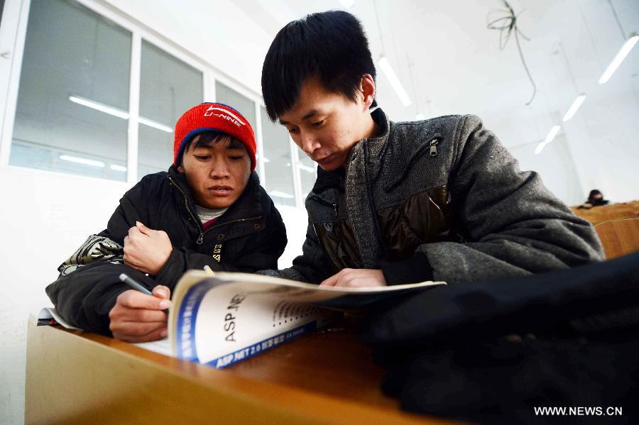 Wang Junsheng (R) studies with his disabled classmate Jiang Jian at school in Harbin, capital of northeast China's Heilongjiang Province, Dec. 19, 2012. Wang Junsheng, a 24-year-old senior student of Harbin University of Commerce, has been helping his disabled classmate Jiang Jian since he made a promise to Jiang's father four years ago. Wang was also nominated for the annual "Moving Heilongjiang" Award this year for his trustworthiness and kindness. (Xinhua/Wang Kai)