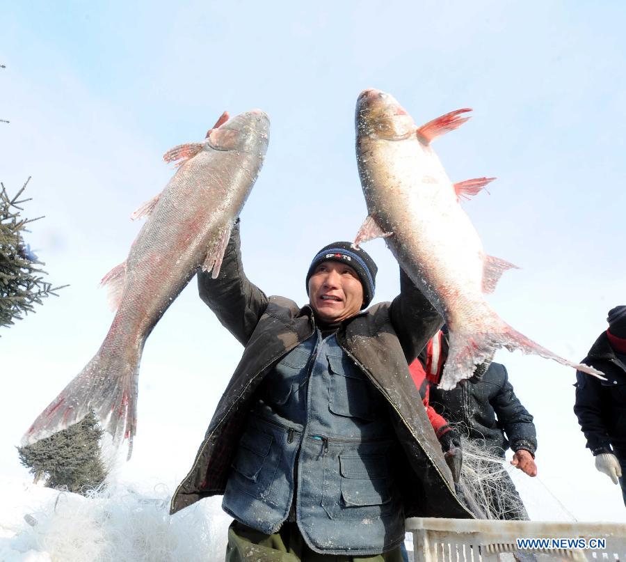 A staff member demonstrates fish caught during a trial fishing in the run-up to a winter fishing festival on the frozen surface of Changling Lake, Harbin, capital of northeast China's Heilongjiang Province, Dec. 24, 2012. Each year, the fishery of Changling Lake turns out 100,000 kilograms of commercial fish. (Xinhua/Wang Song)