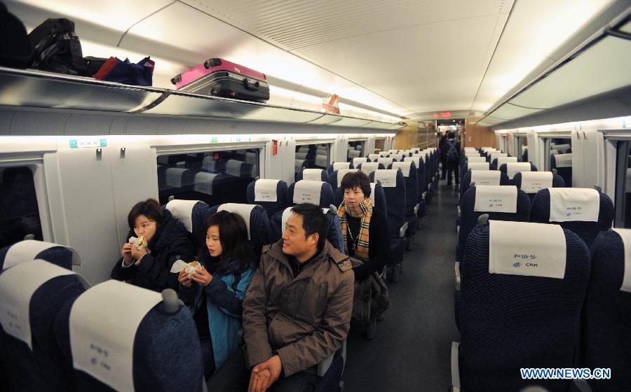 Passengers sit in high-speed train G502 at the Changsha South Railway Station in Changsha, capital of central China's Hunan Province, Dec. 26, 2012. The Changsha South Railway Station is one of the stops of the 2,298-kilometer Beijing-Guangzhou High-speed Railway, the world's longest, which was put into operation on Wednesday. Running at an average speed of 300 kilometers per hour, the high-speed railway will cut the travel time to about 8 hours from the current 20-odd hours by traditional lines between the country's capital and capital of south China's Guangdong Province. (Xinhu/Li Ga)