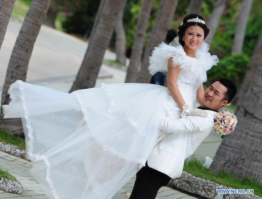A couple pose for wedding photos on the rocks at the seashore in Sanya, a famous tourism city in south China's Hainan Province, Dec. 26, 2012. Hainan has entered its winter tourist season. (Xinhua/Hou Jiansen)