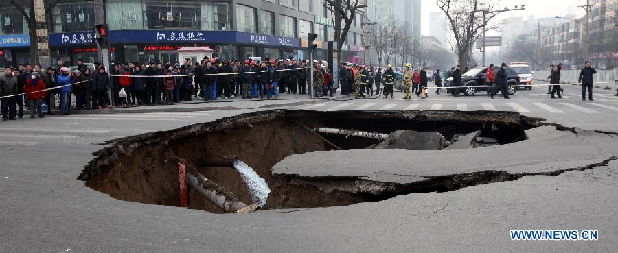 Photo taken on Dec. 26, 2012 shows a collapsed section of a road intersection in Taiyuan, capital of north China' Shanxi Province. A hole, measuring around 5 meters deep and 15 meters wide, appeared after the road section collapsed. No casualties were reported by far. (Xinhua/Shi Xiaobo)