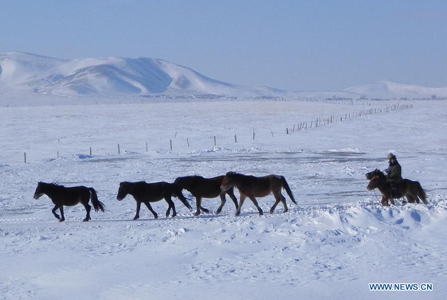 Two herders are seen with their livestock on a snow-covered pasture in Xilingol, north China's Inner Mongolia Autonomous Region, Dec. 26, 2012. Recent snowstorms that struck Inner Mongolia have affected more than two million people and caused 600 million yuan (96.23 million U.S. dollars) worth of direct economic losses. (Xinhua/Li Yunping)