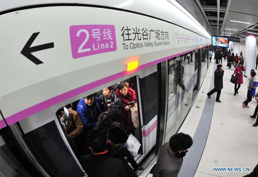 Citizens take the train of subway line 2 in Wuhan, capital of central China's Hubei Province, Dec. 28, 2012. The first stage of subway line 2 of 27.73 kilometers was put into trial operation on Friday. Subway line 2 is the city's first subway line to be put into operation. Its construction started in 2006. (Xinhua/Xiao Yijiu)