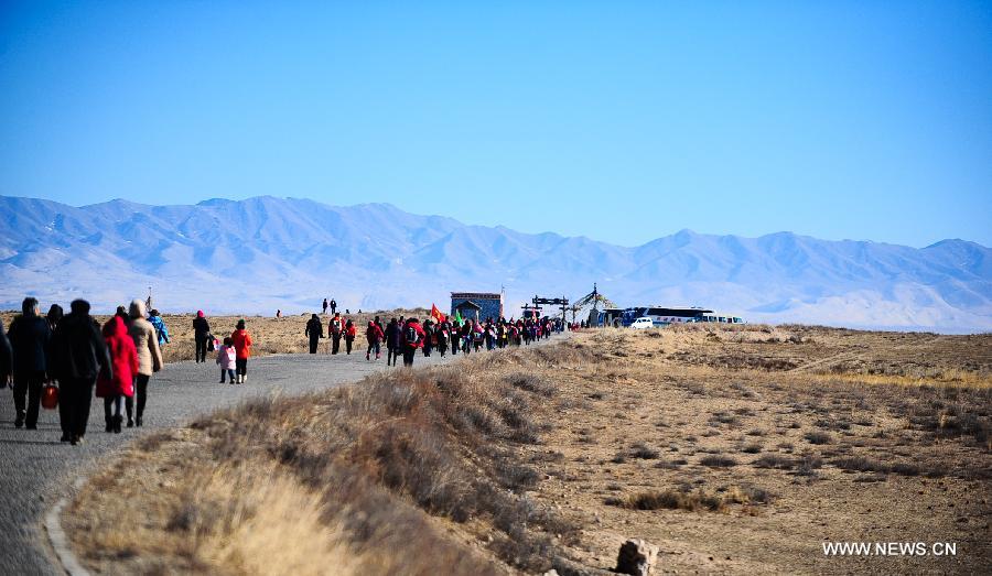 Hikers walk along Qinghai Lake, northwest China's Qinghai Province, Jan. 1, 2013. Over 700 people attended a 13-kilometer hike along Qinghai Lake to celebrate the New Year and promote the idea of low-carbon lifestyle. (Xinhua/Wu Gang)