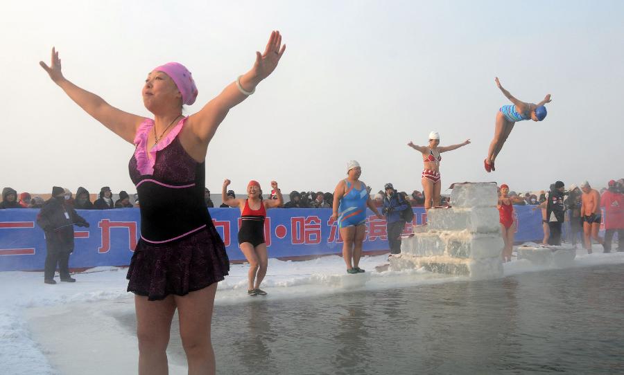 Winter swimmers perform diving in queue in Harbin, capital of northeast China's Heilongjiang Province, Jan. 1, 2013. Over 2,000 tourists from home and abroad watched the winter swimming performance here on Tuesday, the New Year's Day. (Xinhua/Liu Yang)