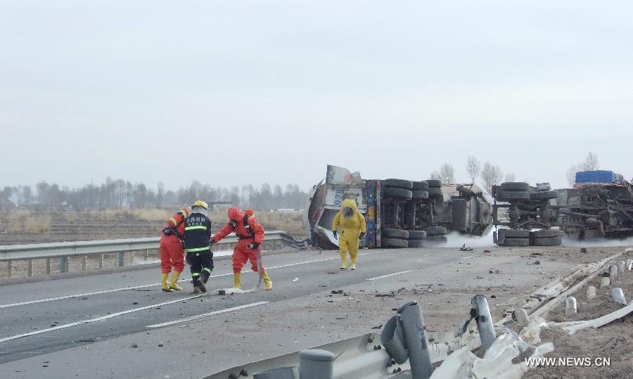 Fire fighters work at the site where a tanker truck turns over on a section of the Lianyungang-Horgos highway in northwest China's Gansu Province, Jan. 6, 2013. The tanker truck carrying 20 tons gas leaked and was in danger of explosion. People in nearby area have been evacuated. (Xinhua/Shen Fu)