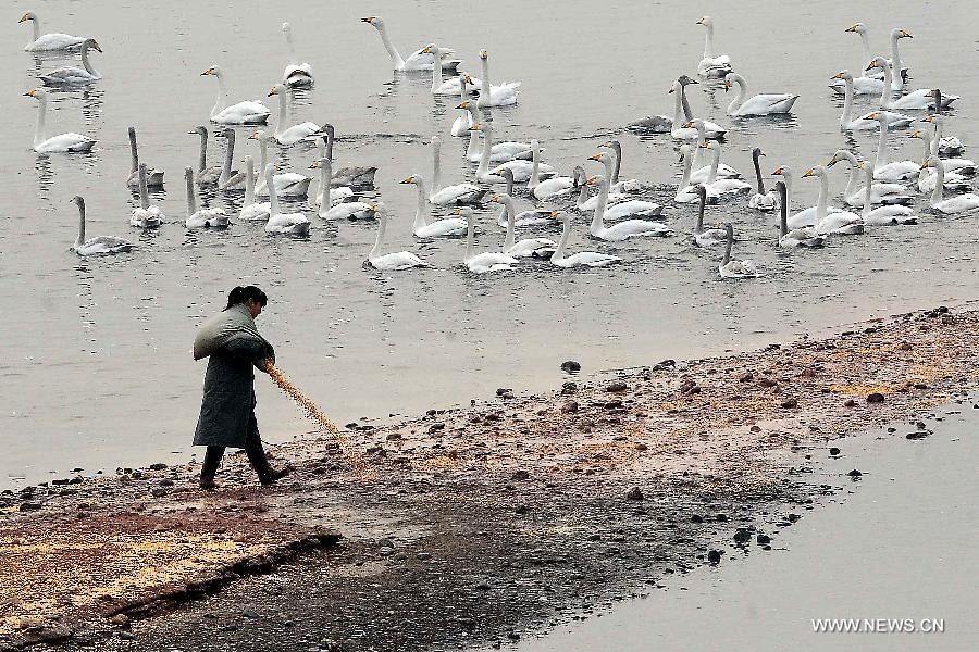 A staff member sprinkles corns at a feeding area in the Yellow River Wetland Reserve in Sanmenxia City, central China's Henan Province, Jan. 5, 2013. The Yellow River Wetland Reserve of Sanmenxia, one of China's three major habitats for swans to live through winter, has kept on feeding swans each winter since 2008 so as to better protect these birds. (Xinhua/Wang Song)