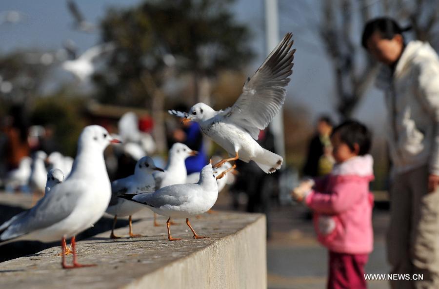 Citizens feed black-headed gulls on Caohai Levee of Dianchi Lake in Kunming, capital of southwest China's Yunnan Province, Jan. 6, 2013. More than 35,000 black-headed gulls chose to spend winter in Kunming this year thanks to comfortable ecological environment in the city. (Xinhua/Lin Yiguang)