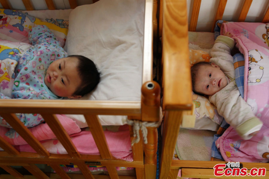Two unhurt babies are seen in cradles in a welfare home in Kaifeng, North China's Henan Province, January 7, 2013. All10 survivors of the Lankao fire have been sent to the welfare home after the accident. The fire broke out in a residential building in Chengguan Township of Lankao County at about 8:30 a.m. on Friday and was extinguished about two hours later. Four children were killed on the spot, three died on the way to hospital and one other is still being treated in the hospital. [Photo: CNS/Wang Zhongju]