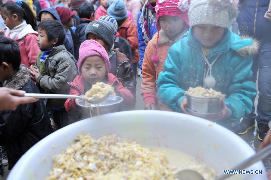 Pupils wait to get nutritious lunch at Longdong Primary School in De'e Township of Longlin Autonomous County of All Nationalities, southwest China's Guangxi Zhuang Autonomous Region, Jan. 8, 2013. Nutritious lunch has been provided for 1.16 million pupils and students of elementary and middle schools in 40 counties and districts of the region. (Xinhua/Zhou Hua)