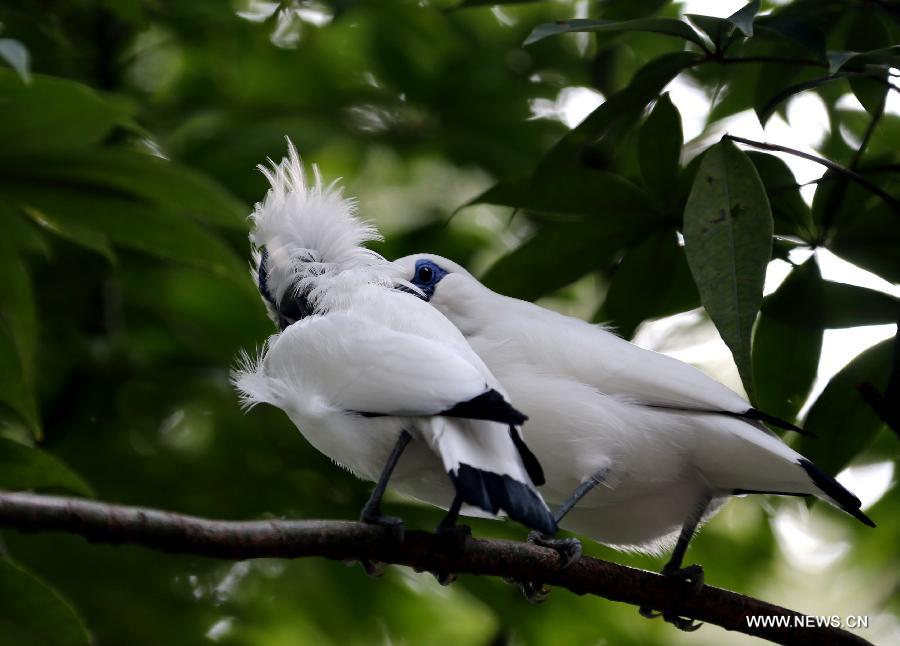 Two birds play on branches in the aviary of Hong Kong Park in south China's Hong Kong, Jan. 8, 2013. The aviary, covering an area of 3,000 square meters, is located on a valley in the south of the park. (Xinhua/Li Peng)