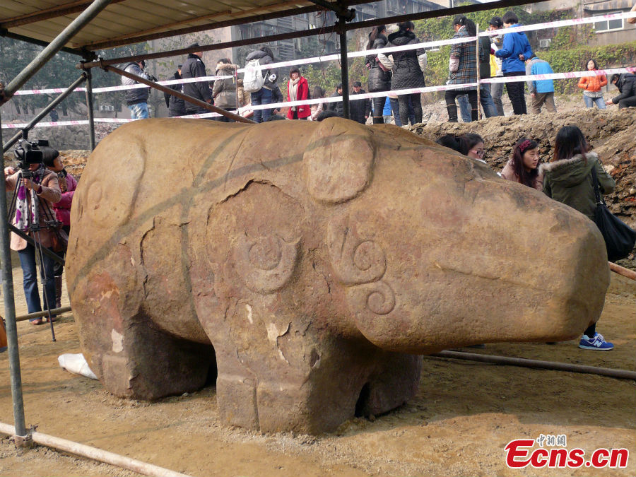 A stone carving of an animal is excavated from an archaeological site at the Tianfu Square in Chengdu, capital of Sichuan Province, January 9, 2013. The sculpture, 3.3 meters long, 1.2 meters wide and 1.7 meters tall, weighs around 8.5 tons. It is made of red sandstone and may date back to the Qin Dynasty (221BC-206BC) or Han Dynasty (206BC-220AD), according to archeologists. [Photo: CNS/Wang Jun]