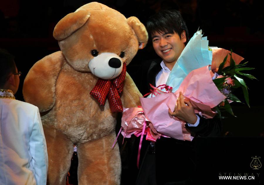 Pianist Lang Lang receives gifts presented by his fans during his new year concert in Wuhu City, east China's Anhui Province, Jan. 8, 2013. (Xinhua)