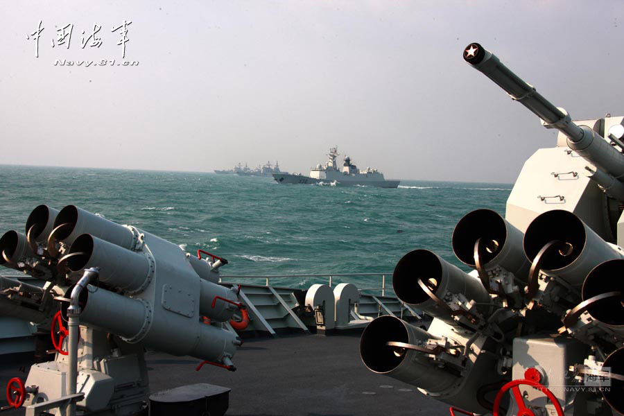 Warships of the East Sea Fleet under the Navy of the Chinese People's Liberation Army (PLA) conducts an offensive-and-defensive drill in a sea area, in a bid to improve troops' actual combat and emergency-handling capability. (navy.81.cn/Fang Lihua, Liu Yaxun)