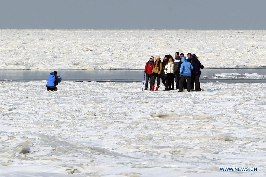 Tourists pose for pictures at the Xiajiahezi bathing beach in Dalian, northeast China's Liaoning Province. A cold snap has led to a layer of thick sea ice in large areas of the Bohai Sea and the Yellow Sea. (Xinhua/Wang Hua)