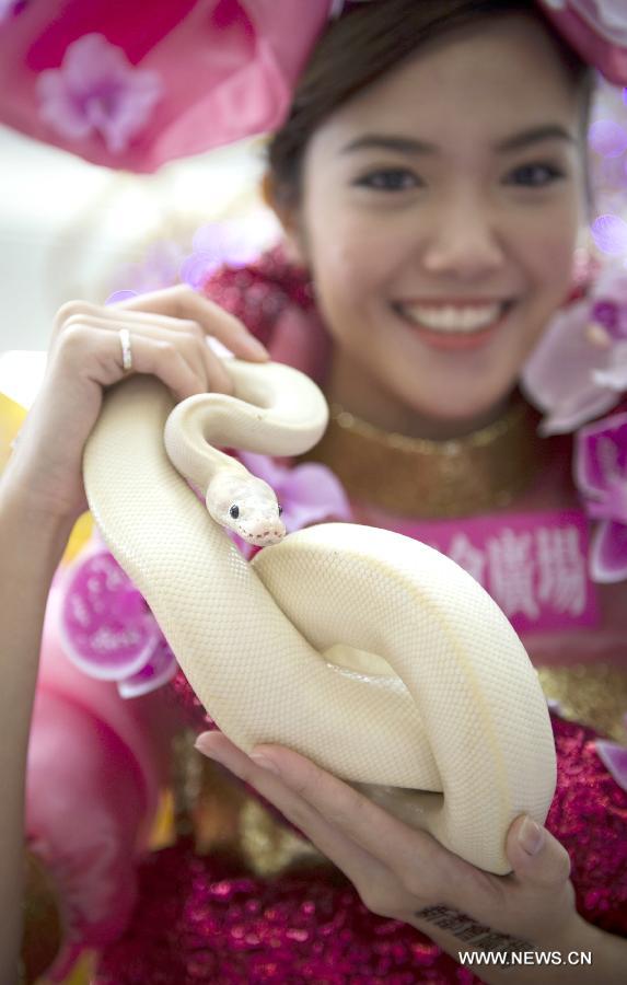 A model presents a white python during a snake show held in a shopping mall in Hong Kong, south China, Jan. 10, 2013. The snake show was held here to welcome Chinese lunar new year, the Year of Snake on the Chinese Zodiac. (Xinhua/Lui Siu Wai)