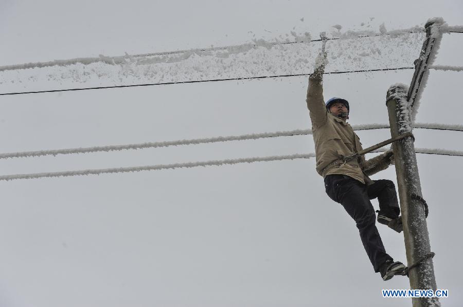 A worker cleans ice on the power line with a bamboo stick in Yongsha Village of Shuangliu Township in Kaiyang County, southwest China's Guiyang, Jan. 10, 2013. Local power grid company sent workers to clean power lines which couldn't melt the ice with automatic equipment. (Xinhua/Ou Dongqu)