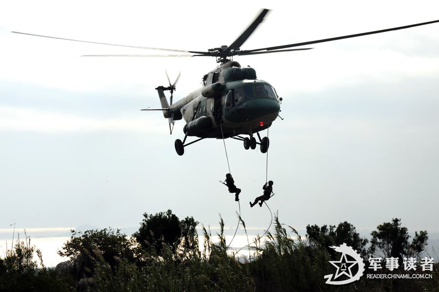 A division under the Nanjing Military Area Command (MAC) of the Chinese People's Liberation Army (PLA) organizes a helicopter air-landing training, in a bid to all-roundly temper troops' actual-combat and rapid delivery capability. (China Military Online/Xiao Qingming)