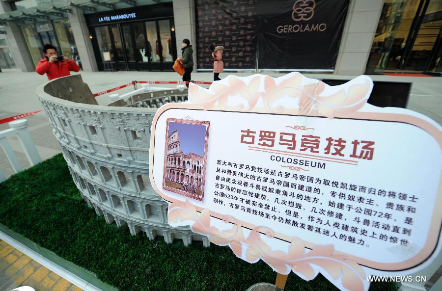 A miniature monument of Colosseum is seen on a street in Xi'an, capital of northwest China's Shaanxi Province, Jan. 10, 2013. A collection of miniatures of 10 world cultural heritages are on show here. (Xinhua/Li Yibo)