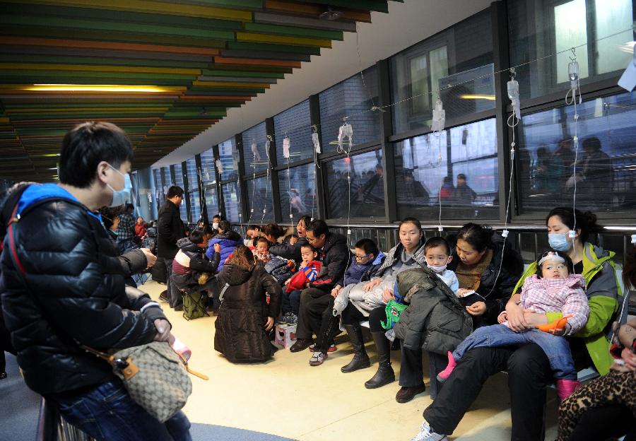 Parents accompany their children having IV drip at the temporary transfusion area of Beijing Children's Hospital in Beijing, capital of China, Jan. 13, 2013. Beijing was shrouded in dense smog for a 3rd straight day on Sunday. Winter has always been a high-occurrence season for respiratory infection diseases. The recent smog in Beijing caused an increase in children's respiratory infection. (Xinhua/Luo Xiaoguang)