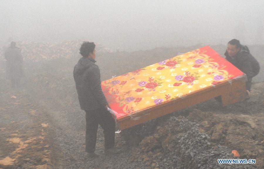 Villagers carry a mattress donated by a company in the makeshift tent area near the Gaopo Village in Zhenxiong County of Zhaotong City, southwest China's Yunnan Province, Jan. 14, 2013. Forty-six people died and 2 others injured in a landslide which hit the Zhaojiagou area of Gaopo Village around 8:20 a.m. on Jan. 11. More than 500 villagers have been moved to makeshift tents near the village. (Xinhua/Chen Haining)