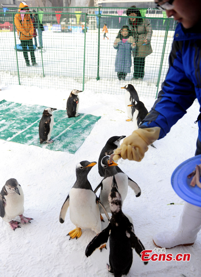 Photo taken on January 14 shows penguins at the Polar Winter Carnival, held at the Beijing Workers' Stadium. [CNS Photo / Zhang Qin]