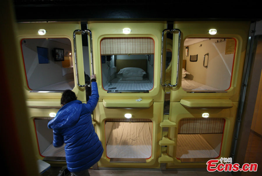 A reporter visits a "capsule" hotel in Qingdao, Shandong Province, January 15, 2013. The hotel, dubbed China's largest "capsule" hotel so far, features 100 bedrooms with each 1 meter wide, 2 meters long and 1.2 meters high. Each room is equipped with power supply, TV set and even WIFI, attracting many young people to lodge. [Photo: CNS/Xu Chongde]