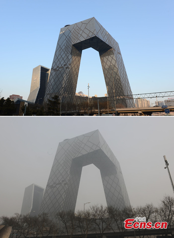 Beijingers on Wednesday saw their first sunshine in seven days, with a cold front dispersing the lingering smog in the city. The photos are respectively taken on January 16 (above) and January 13 . [Photo: CNS / Li Xueshi]