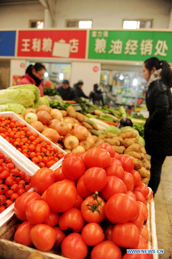A local resident selects vegetables at a market on Tabei Road in Shijiazhuang, capital of north China's Hebei Province, Jan. 16, 2013. According to the Ministry of Commerce, the price of agricultural products in 36 large-and-medium-sized cities across the nation continued to rise from Jan. 7, 2013 to Jan. 13, 2013, a continuous rising in 11 consecutive weeks. (Xinhua/Zhu Xudong)