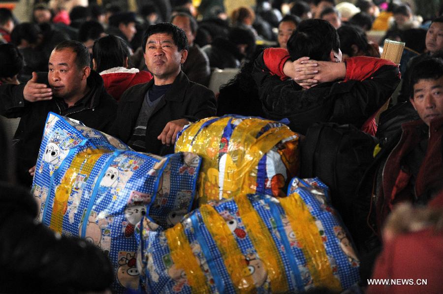 Migrant workers from central China's Henan Province wait for the train at the Hangzhou Railway Station in Hangzhou, east China's Zhejiang Province, Jan. 17, 2013. Some migrant workers have started to return home in order to avoid the Spring Festival travel peak that begins on Jan. 26 and will last for about 40 days. The Spring Festival, the most important occasion for a family reunion for the Chinese people, falls on the first day of the first month of the traditional Chinese lunar calendar, or Feb. 10 this year. (Xinhua/Ju Huanzong)