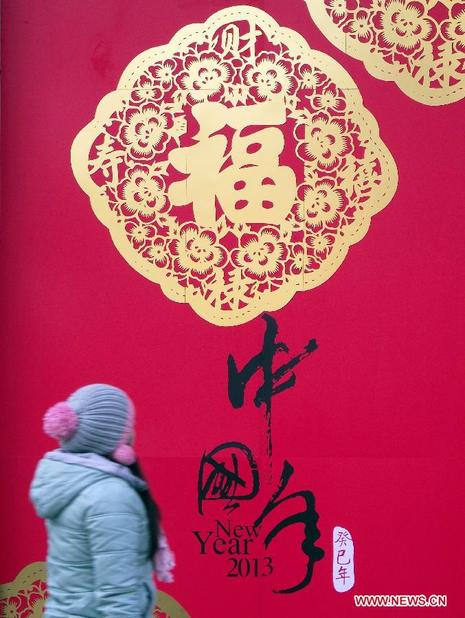 A woman looks at a wall decorated with the artworks of paper-cut in the Xinjiekou business district in Nanjing, capital of east China's Jiangsu Province, Jan. 17, 2013. Stores and shops in the Xinjiekou business district were decorated with holiday items to welcome the coming Spring Festival. (Xinhua/Wang Qiming)