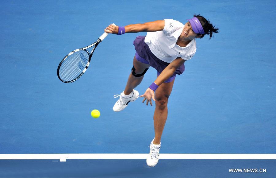 Li Na of China serves during her third round women's singles match against Sorana Cirstea of Romania on the fifth day of 2013 Australian Open tennis tournament in Melbourne, Australia, Jan. 18, 2013. Li Na won 2-0.(Xinhua/Chen Xiaowei)