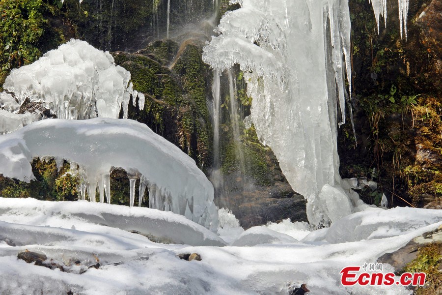 Leigong Mountain, located in southwestern Guizhou Province, is between 800 and 1,200 meters above sea level. It is not only a national nature reserve but a national forest park. Photo taken on January 19 shows the icefall scenery at the Leigong Mountain. [Photo: CNS / Huang Wanxin]