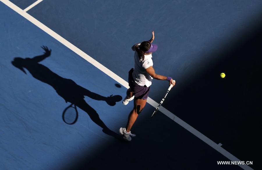 Li Na of China hits a return during her fourth round women's singles match against Julia Goerges of Germany on the seventh day of 2013 Australian Open tennis tournament in Melbourne, Australia, Jan. 20, 2013. Li Na won 2-0. (Xinhua/Chen Xiaowei)