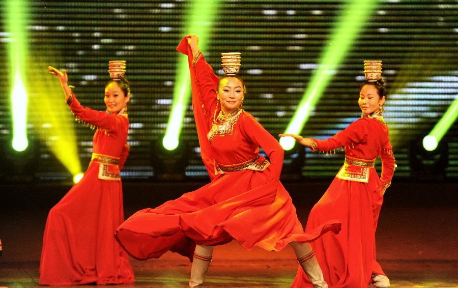 Dancers perform during a variety show for the Snow and Ice Culture Festival in Xilinhot City, north China's Inner Mongolia Autonomous Region, Jan. 18, 2013. The festival will last from Jan. 18 to Feb. 25. (Xinhua/Zhao Tingting)