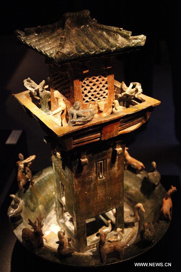 A Chinese terracotta tower is on display at the 58th Brussels Antiques & Fine Arts Fair (BRAFA) in Brussels, Belgium, Jan. 19, 2013. A total of 128 antique and fine art dealers from across the world will showcase their most precious pieces of art during the one-week fair. (Xinhua/Wang Xiaojun)