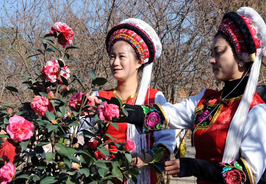 Girls watch camellia flowers during the 2013 Kunming Camellia Festival at Green Lake Park in Kunming, capital of southwest China's Yunnan Province, Jan. 22, 2013. The festival opened here Tuesday. (Xinhua/Yang Zongyou)