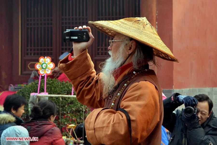 File photo taken on Jan. 23, 2012 shows a visitor films temple fair activities in Zhengzhou, capital of central China's Henan Province. Temple fair in central China area is an important social activity for local people. The ancient temple fairs in central China were ceremonious sacrificial rituals. As time goes by, the focus of temple fair activities has shifted from "gods" to "people". The modern temple fair in central China is a platform of displaying folk culture as well as a channel for commodity circulation. According to statistics from the provincial cultural sector, there are about 35,000 temple fairs each year in Henan. (Xinhua/Wang Song)
