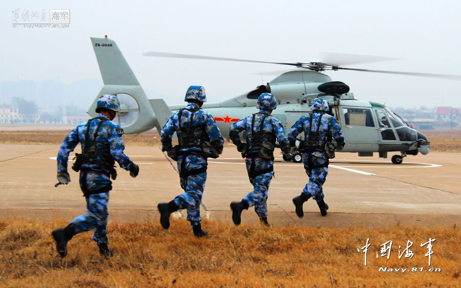 A carrier-based aircraft regiment under the North Sea Fleet of the Navy of the Chinese People's Liberation Army (PLA) conducts tactical training at an airport in Shandong province. During the training, several special operation members slided down rope to the ground from the helicopters, and quickly conducted the tactical training, in a bid to temper their tactical skills, and to enhance their actual combat capability in implementing various military missions. (navy.81.cn/Hu Baoliang, Ma Nengmei, Gao Wei)