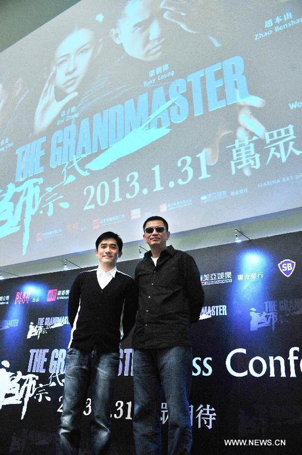 Film director Wang Kar-wai (R) and actor Tony Leung attend the press conference of the film "The Grandmaster" at Marina Bay Sands' ArtScience Museum in Singapore, Jan. 23, 2013. (Xinhua/Then Chih Wey)