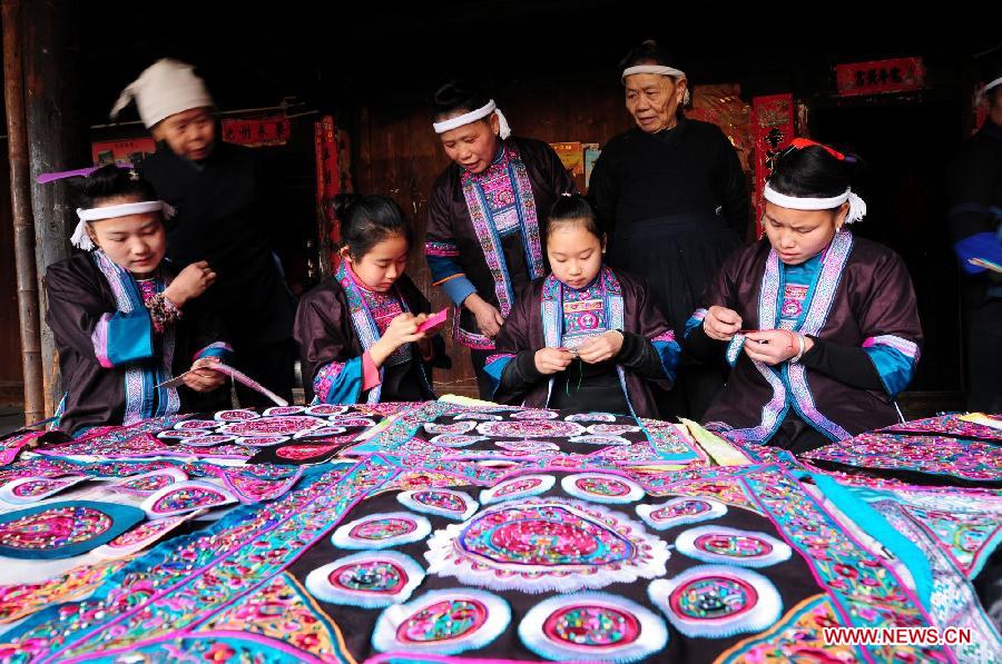 Women of Dong ethnic group make embroidery works at Tongle Village in Sanjiang Dong Autonomous County, southwest China's Guangxi Zhuang Autonomous Region, Jan. 26, 2013. The embroidery works made by Dong women have been sold to Britain. (Xinhua/Liang Kechuan)