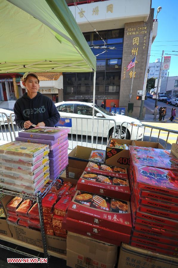 A vendor sells Spring Festival snacks at a sidewalk booth in China Town of San Francisco, the U.S., Jan. 26, 2013. San Francisco began its "Sidewalk Merchandise Displays Expanded for Chinese New Year" project on Saturday. (Xinhua/Liu Yilin)