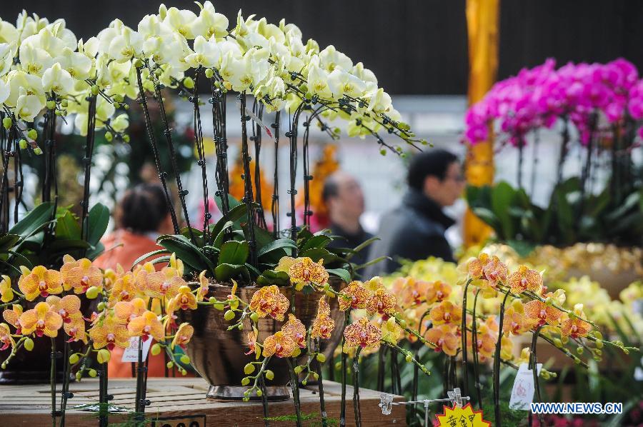 Flowers are laid for sale in Chuanhua garden house in Hangzhou, capital of east China's Zhejiang Province, Jan. 28, 2013. More than 10,000 pots of flowers were displayed here for sale before the traditional Chinese Lunar New Year. (Xinhua/Xu Yu)
