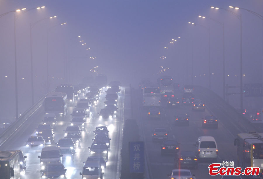 Vehicles move slowly in dense fog in Beijing, January 29, 2013. The local meteorological center issued an orange alert as foggy weather reduced visibility and worsened air pollution. [Photo: CNS/Ma Yihang]