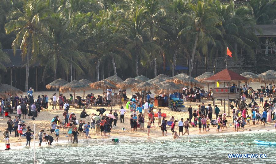 Tourists enjoy themselves at the Boundary Island scenic area in Lingshui Yi Autonomous County in south China's Hainan Province, Jan. 30, 2013. Hainan launched tourism promotion with the theme of fresh air, to attract visitors from northern China where heavy haze lingered recently. (Xinhua/Zhao Yingquan)