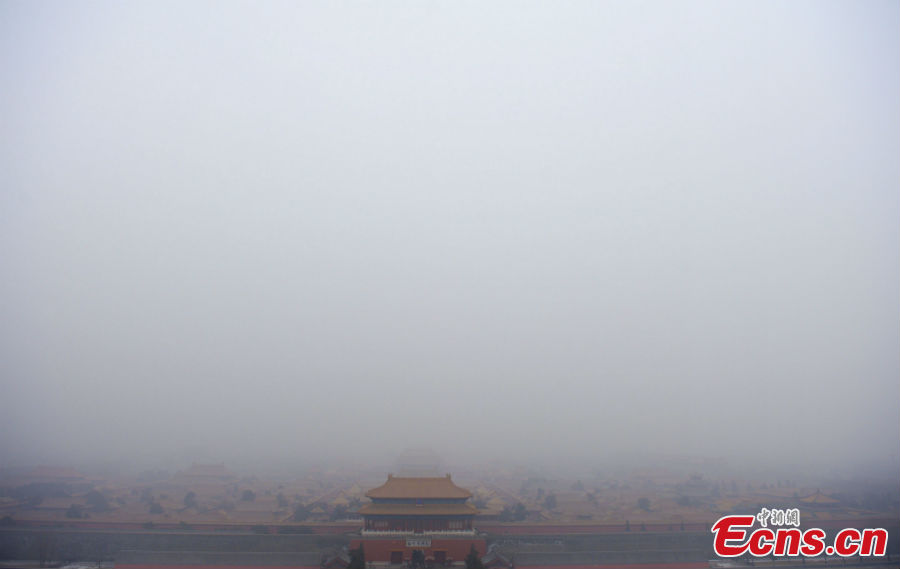 The Forbidden City is enveloped in dense fog in Beijing, January30, 2013. As smog continues to cloak the capital with pollution levels that are off the charts, officials urged residents to stay indoors on Wednesday as emergency measures were rolled out aimed at countering the bad weather. [Photo: CNS/Liu Zhen]