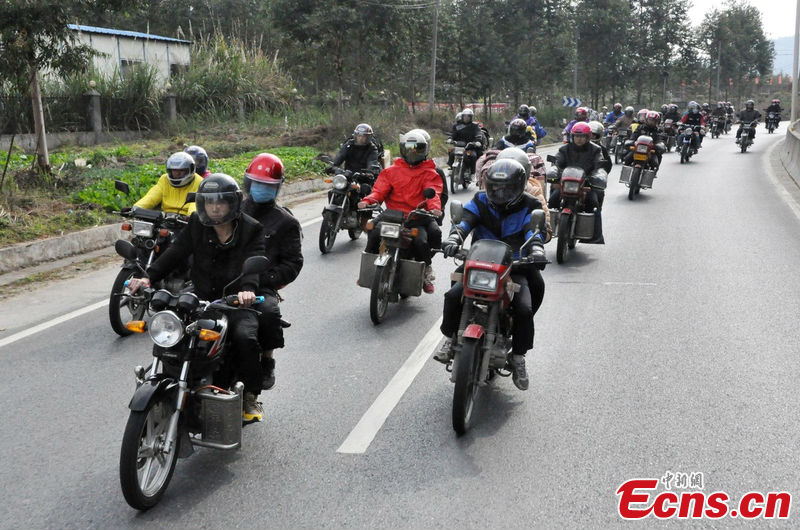 Migrant workers are back in the saddle after resting at a highway toll station in Fengkai County, Guangdong Province, January 30, 2013. Local traffic police said about 3,000 such bikes passed through the county every day. China's transportation system has to undergo a challenge during every Spring Festival holidays, which sees a huge number of people take to the roads for family reunions. To have reunion dinner with their families on Chinese New Year's Eve, those who have worked or studied away from home scramble to leave for their hometowns by all means—train, coach, airplane, ship, self-driving, motorcycles and even bicycles, making the largest annual human migration in the world. [Photo: IC Press]